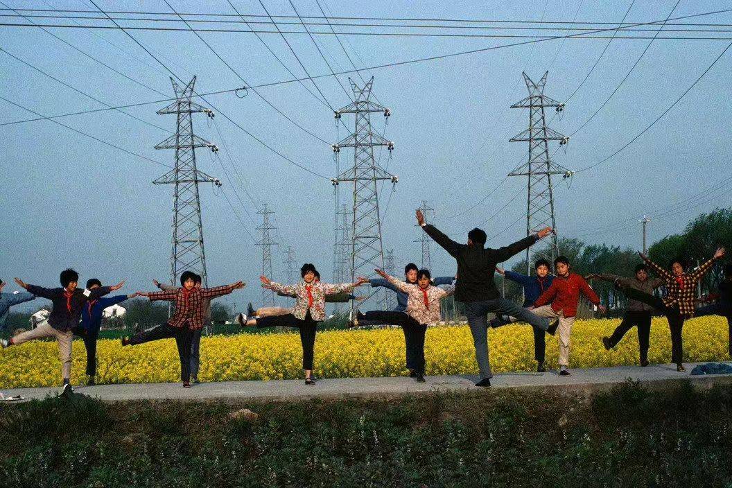 照片中,老师带着学生们在乡间的马路上做早操。即使只是透过照片,仿佛都能闻到田野中花朵的香气。那个时候,孩子们的每一个动作都跟随着老师的口号声,照片显示出当时并没有统一的校服,大家穿着自己家里的衣服,简单而自然。