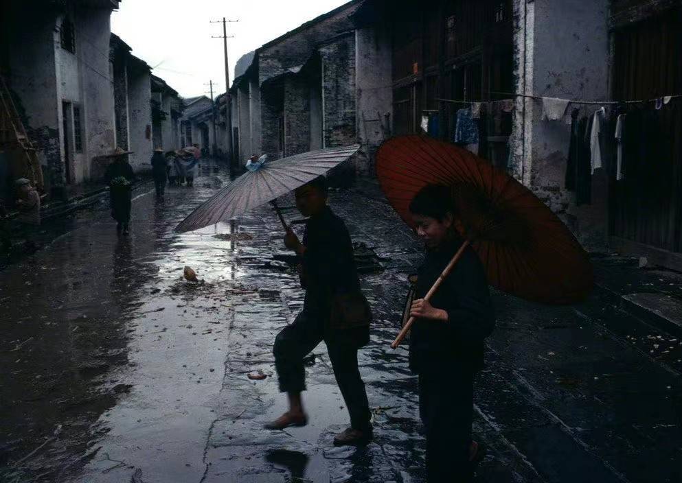 另一张照片拍摄的是阴雨连绵的天气,两个小男孩在打着油纸伞。看着这张照片,仿佛能感受到江南梅雨季节那种静谧又温暖的氛围,你喜欢这样的天气吗?