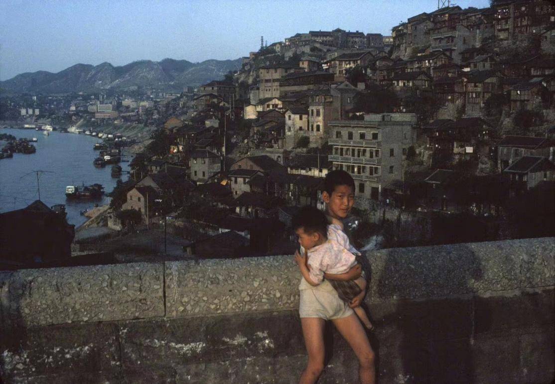 这张照片可能是拍摄于中国的某个山区。照片中的小男孩怀抱着弟弟,似乎有些羞涩,不太愿意面对镜头。背后的山水风光美丽动人,令人向往。