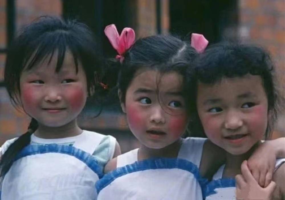 接下来是一张幼儿园女孩们的合照,她们脸上带着浓浓的腮红,记得那个时候,化妆活动经常会在眉心点上一个小红点,用红纸折成大红花装饰自己。那时的快乐简单纯粹,甚至不需要太多的物质享受。