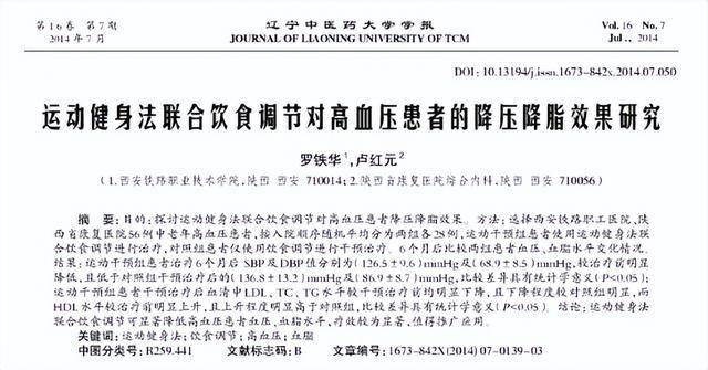 [1]罗铁华.运动健身法联合饮食调节对高血压患者的降压降脂效果研究,辽宁中医药大学学报,2014-07-01