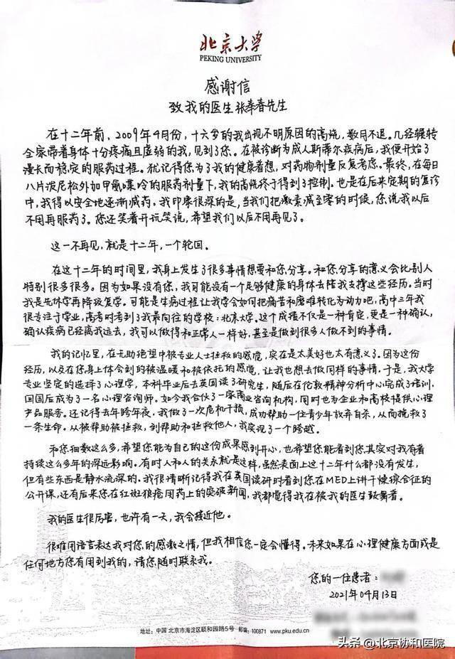 ▲历经12年轮回,曾经四处辗转求医的患者如今已经顺利从北京大学毕业,并成为一名心理咨询师。那个曾经被张奉春从死亡线上拉回来的患者,如今成为了挽救少年生命的“天使”