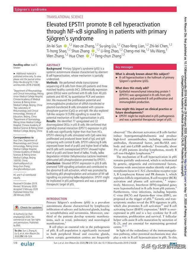 ▲张奉春带领团队探究原发性干燥综合征B细胞的基因表达谱,发现上皮基质相互作用蛋白1(EPSTI1)表达,并首次揭示该蛋白调控B细胞异常活化的机制。该成果发表于风湿病学顶尖杂志《风湿病学年鉴》(Annals of the Rheumatic Diseases)上