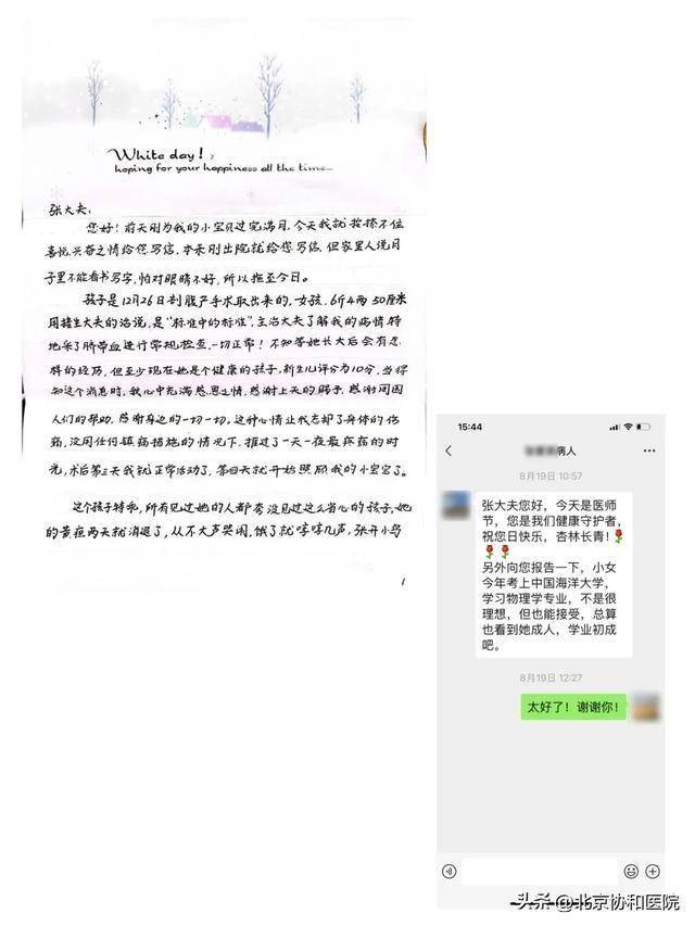 ▲左上:河南的红斑狼疮患者生下健康宝宝后给张奉春的来信(部分节选);右下:曾经的宝宝今年顺利考上大学,妈妈在医师节之际给张奉春发来祝福