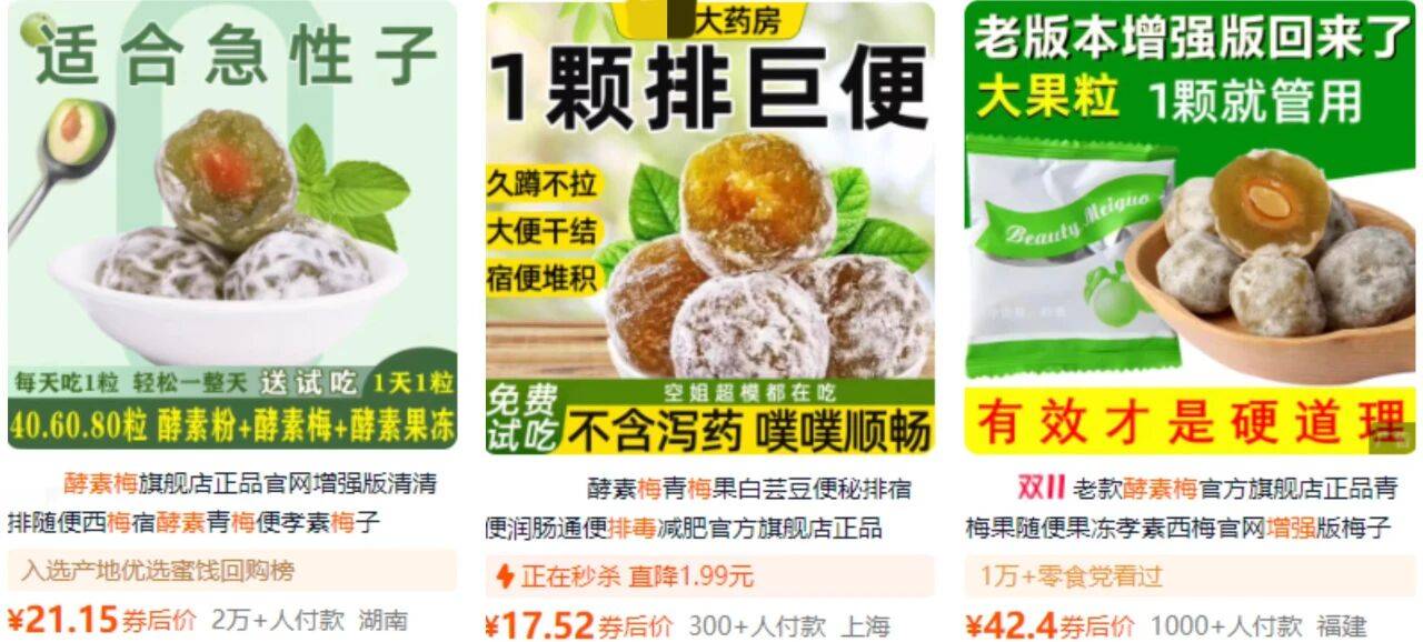 同样在市场上“风生水起”的减肥食品,还有那些打着酵素概念的酵素梅、瘦身梅、纤纤梅、排毒梅等产品。但它们的“减肥”效果可能并不完全来自酵素本身,而是更多地依赖具有润肠通便作用的成分。