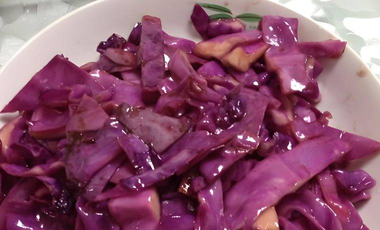 炒好的紫甘蓝口感脆嫩,且不塞牙,每日食用小半盘,不但可补充花青素,还能让肚子舒适