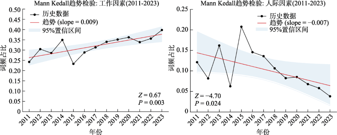 曾经,比工作内容更累的是人际关系,处理不完的“人情世故”,给本就疲惫的高压力工作人群“雪上加霜”。而站到时间轴长河里,课题组发现了更耐人寻味的变化。通过20112023年间的文本数据进行年代分析,发现工作因素的影响占比一路攀升,人际因素却呈下降趋势。这是啥意思呢?以前说起情绪内耗,和同事闹矛盾”“被领导穿小鞋这类人际纠葛常是绕不开的话题;可现在,活干不完”“绩效压力大”“行业卷到没边成了更扎心的痛点。工作的快节奏、高负荷逼得高压力工作人群没有精力和心思来应对多余的人际关系,这种变化也让干活成了如今高压人群情绪消耗里更突出的那根引线