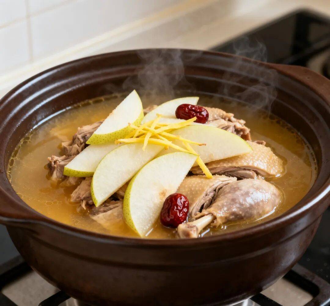 雪梨煨老鸭具有清肺化痰、生津止渴等作用,适于秋季进补食用。