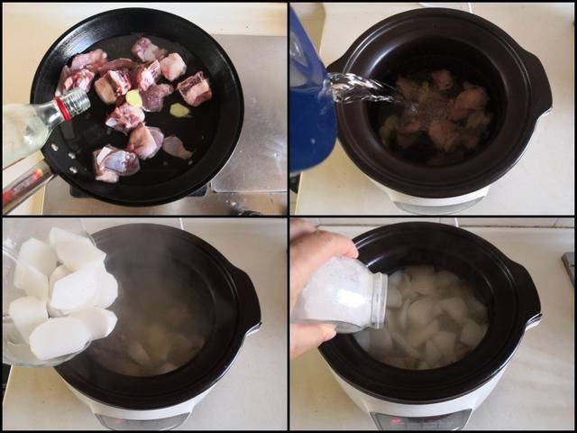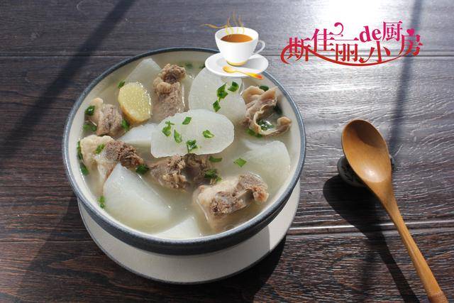 制作过程: 将羊排剁成块备用; 白萝卜去皮后切成滚刀块备用; 烧锅水, 将羊排放进冷水锅中焯水, 加入姜片和高度白酒去腥,焯出浮沫后用热水冲洗干净后放入电炖锅中,加入几片姜,再加入适量的水,按下电炖锅上炖煮牛羊肉的功能键, 还剩下30分钟时加入准备好的白萝卜继续炖煮, 最后炖煮好后加入少许盐和胡椒粉调味,盛入钵中撒上少许葱花即可。