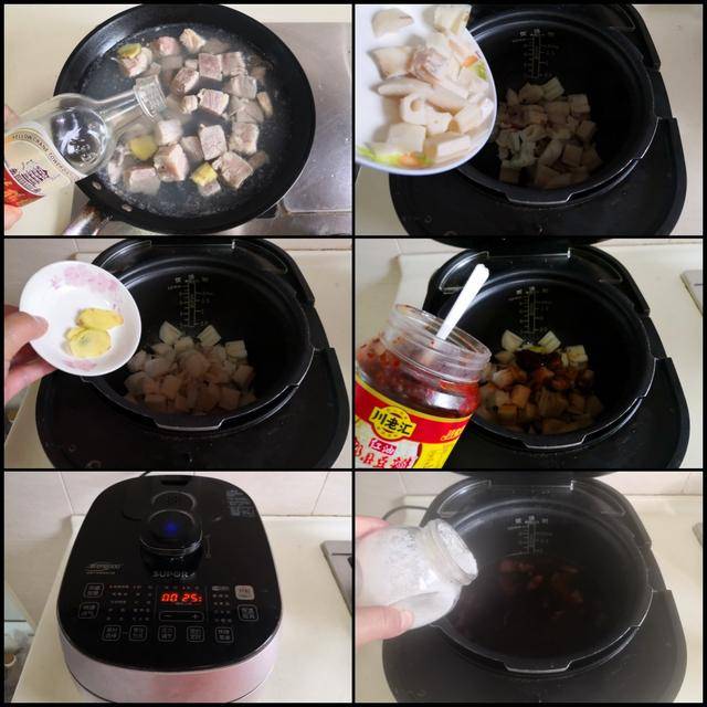 制作过程: 将牛肉切成小块; 莲藕去皮后切成小块备用; 将牛肉块放入冷水锅中焯水,加入少许姜片和高度白酒去腥, 焯好的牛肉放入电炖锅中,加入莲藕块,再加入少许姜片,加入少许料酒和酱油, 再放入1勺郫县豆瓣酱,加入没过食材一半的水,按下电炖锅上炖煮牛羊肉的功能键, 待到炖煮好后加入少许盐和胡椒粉翻炒均匀, 最后加入少许葱花即可。