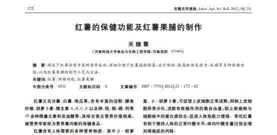[1]关随霞,红薯的保健功能及红薯果脯的制作,2012-11-10