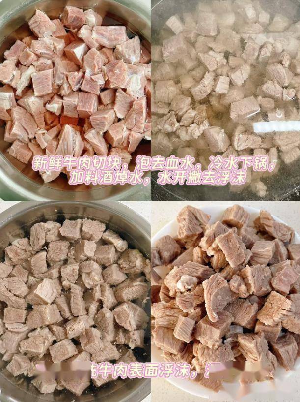 材料:适量牛肉,适量白萝卜,适量胡萝卜,葱姜蒜,干辣椒,八角,香叶,适量盐。