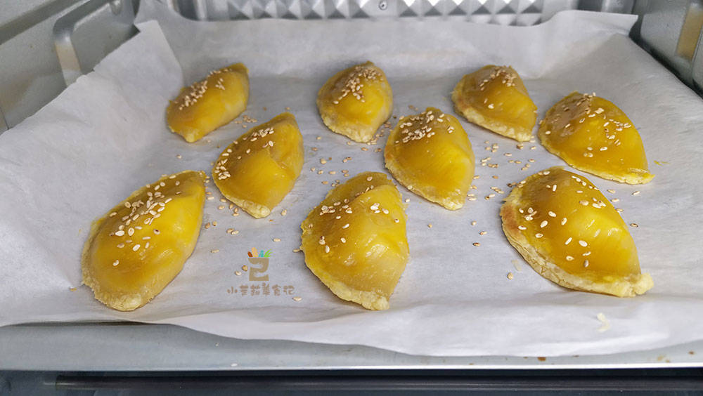 5、先放到烤箱里,用180度加热十五分钟,届时其基本成型,把外壳剥下来,刷上蛋黄液,撒点芝麻。再放进烤箱里,继续烘烤二十分钟左右,其焦黄上色,质地酥脆就熟了。