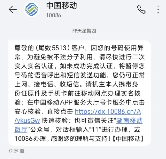 随后,他们通过中国移动APP线上申诉,预留了杨女士的手机号作为联系方式。然而,杨女士的手机号码也随即被关停了,理由是 “使用异常” 。