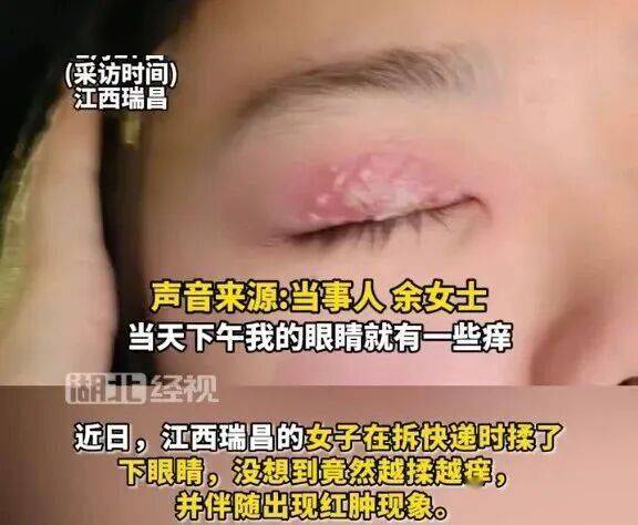 无独有偶,江西瑞昌的余女士在拆快递时顺手揉了揉眼睛,没想到竟然越揉越痒,并伴随出现红肿、疙瘩和凸起现象,去医院就诊后被确诊为疱疹,分析原因估计是她身体抵抗力低,拆快递后没洗手直接揉眼睛,感染了病毒所引起的。余女士恢复了半个月才好。