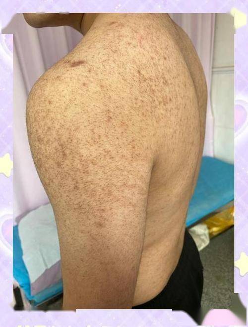 仔细观察这些皮损,会发现它们呈现为针尖至粟粒大小的肤色、淡红色或褐色丘疹。如果用指甲轻轻刮过,能感受到明显的粗糙感;若仔细看,可见每个丘疹顶端有一个淡褐色的角质栓,剥去后可见一个微小的凹陷,仿佛被微型火山口点缀的皮肤地貌。这些皮损通常对称分布,最常见于上臂外侧、大腿前侧、臀部和脸颊两侧。