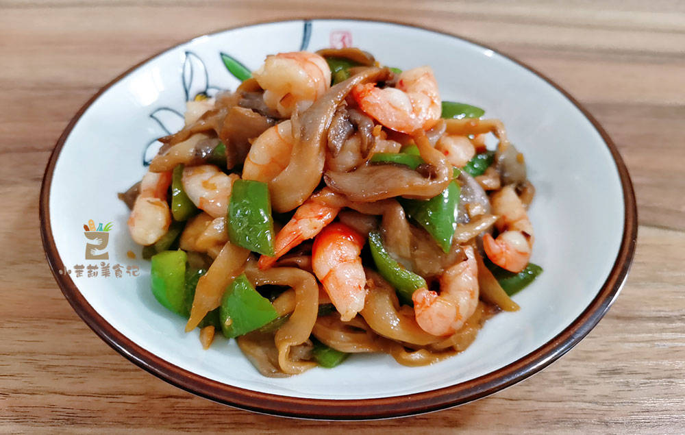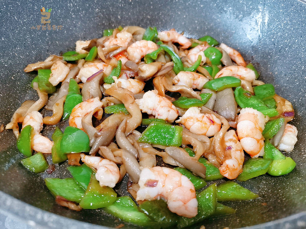 5、葱蒜放底油中,柿子椒和平菇都放进去,多炒一会儿,调入酱油和盐各少许,虾仁也放进去,炒入味后,马上出锅。