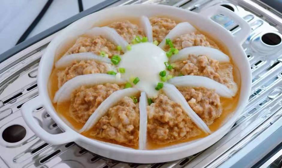 3、将其分别包入肉馅,依次在盘中摆放好,中间的部分磕入鸡蛋,放到蒸箱里边。加热二十分钟,鲜美的汤汁都被蒸出来了,再撒些葱花即可上桌。
