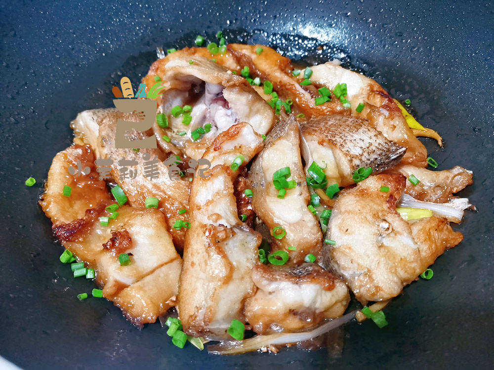 4、底油留少量,放些葱姜,料酒,生抽,醋,糖,热水一碗,汤汁调好后,鱼块加进去,不要盖子,直接敞着锅加热,中大火把汤汁收干就入味了。撒些葱花出锅。