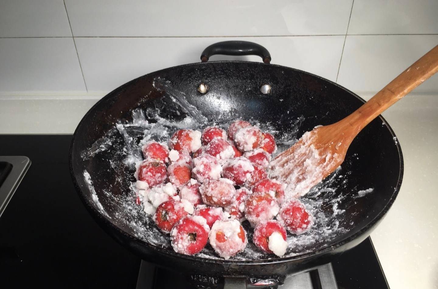 4、稍微晾一会儿,可以用手放到锅的上方感受下,温热的状态时,山楂倒里边,快速炒,一直炒就能看到表面裹上白色的糖霜。届时盛出来即可。