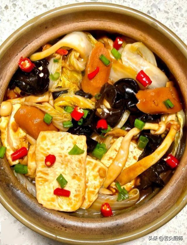 7. 关火后撒上蛋丝和葱花,即可享用(菌菇豆腐煲滑嫩鲜香,适合康复期补充蛋白质)。