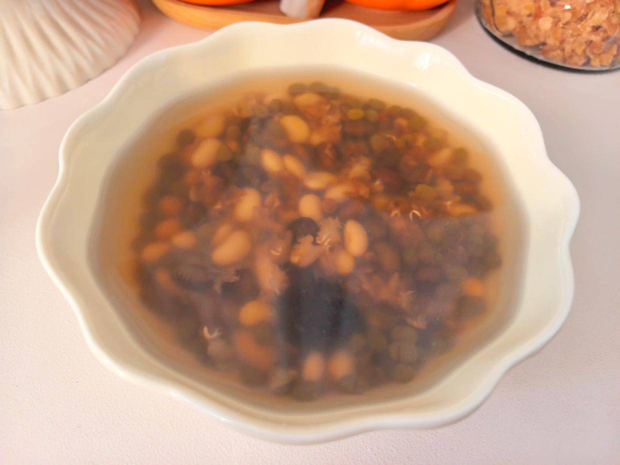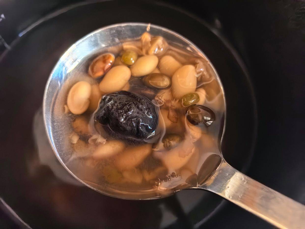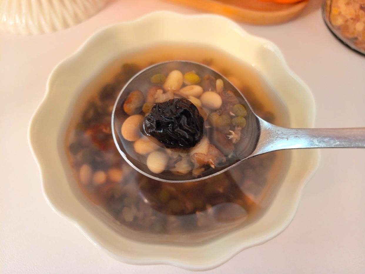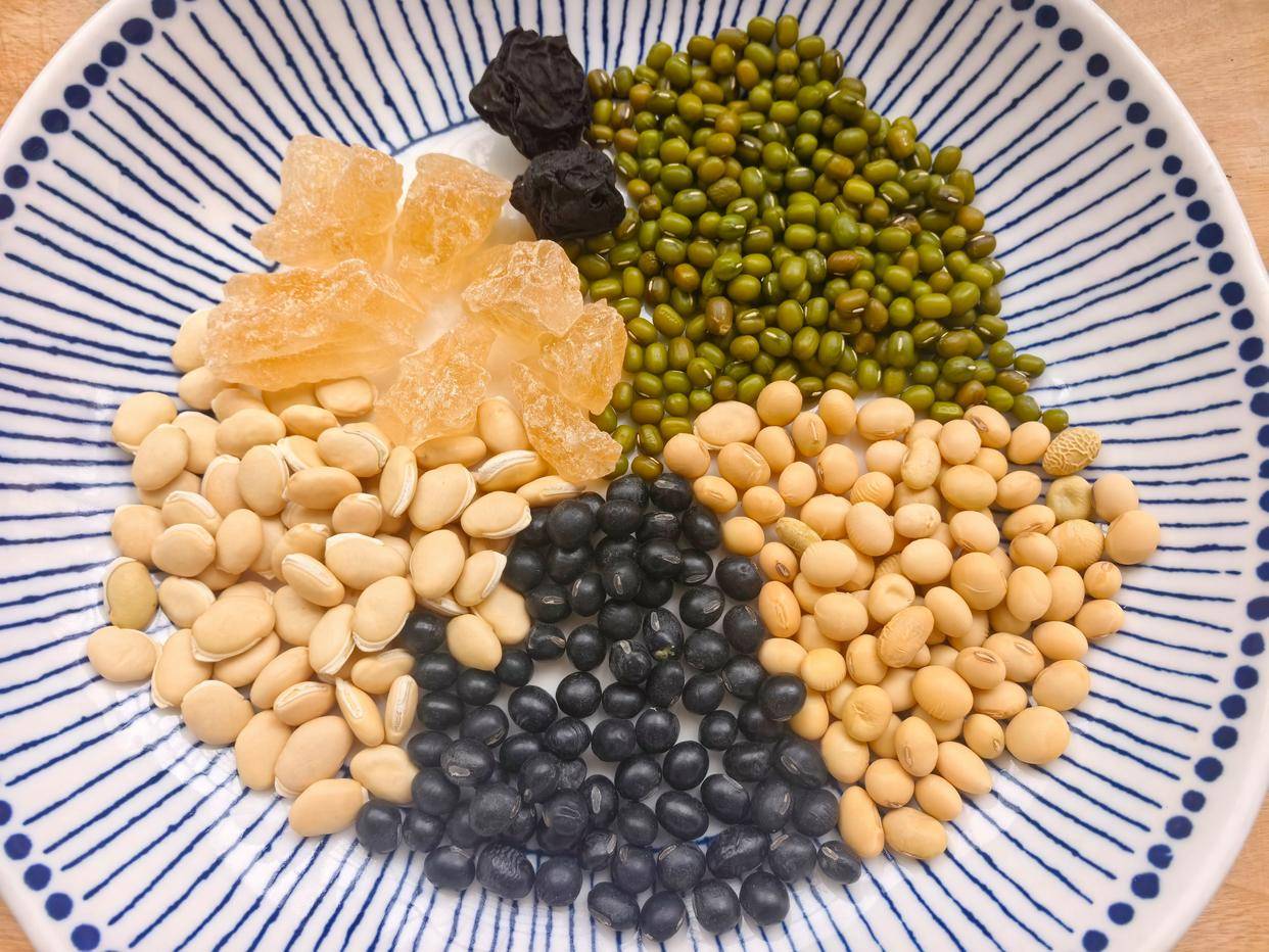 主要食材:黄豆 50克、绿豆 50克、黑豆 50克、白眉豆50克、乌梅 2颗、冰糖 适量清水2000毫升(可根据喜好调整浓淡)