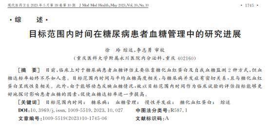 目标范围内时间在糖尿病患者血糖管理中的研究进展,徐玲;李志勇,现代医药卫生,2023-05-30
