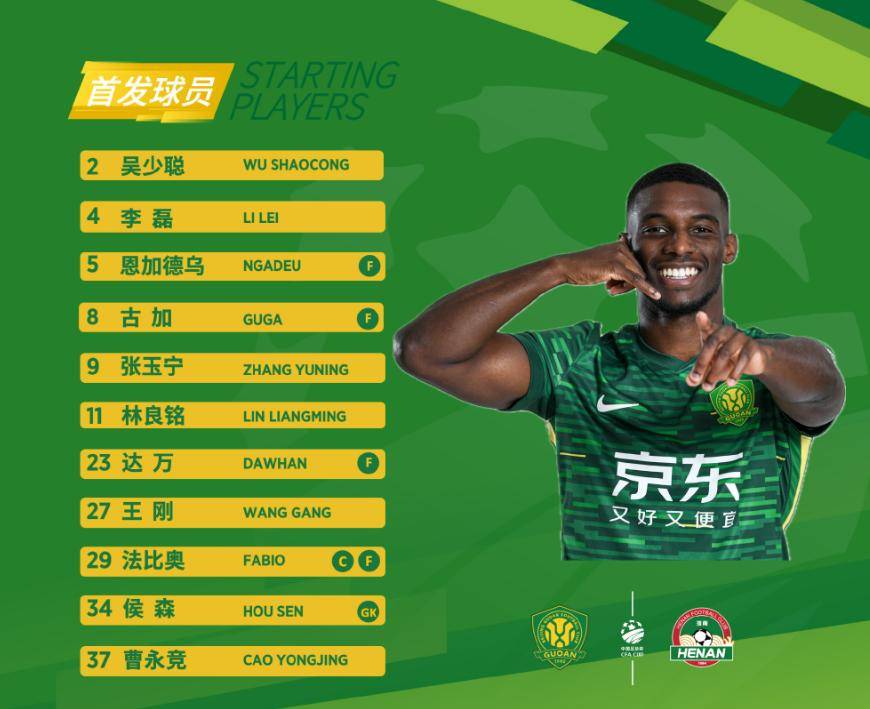 比赛的阵容方面,北京国安排出了442阵型,首发阵容为:34号侯森、4号李磊、2号吴少聪、5号恩加德乌(F)、27号王刚、11号林良铭、8号贡萨洛(F)、23号达万(F)、37号曹永竞、29号法比奥(F)、9号张玉宁。河南队则采用433阵型,首发阵容为:18号王国明、22号黄锐烽、23号卢卡斯·马亚(F)、36号迈达纳(F)、4号叶力江·什那尔、38号卢永涛、6号王上源、7号钟义浩、11号阿奇姆彭(F)、9号费利佩·卡多索(F)、40号纳萨里奥(F)。国安的塞尔吉尼奥和张稀哲都坐在替补席,河南队的替补阵容相对较为薄弱。