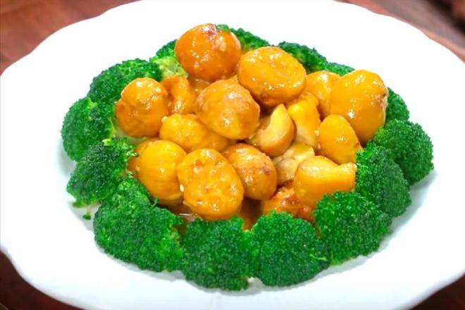 5、把做好的板栗装进刚才摆好西兰花的盘子里。这一盘板栗焗蛋黄就大功告成了。翠绿的西兰花围着金黄的板栗,那画面别提多好看了。