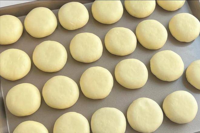 3、包馅。把小面团擀圆,翻个面,把搓好的板栗馅放在中间,然后用虎口慢慢收口,把馅包起来。包好之后,收口朝下,用刮板稍微压扁一点,放进烤盘里。