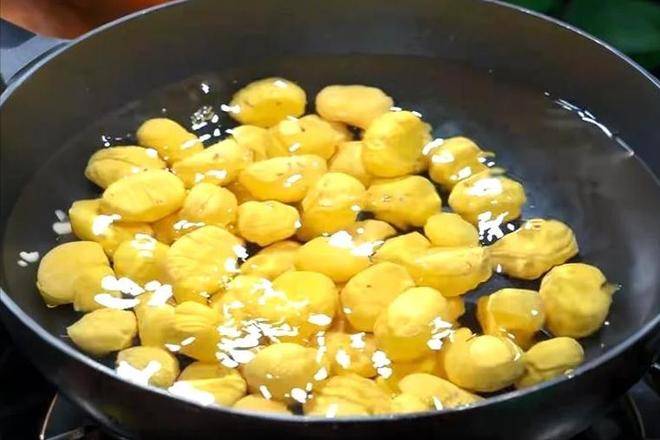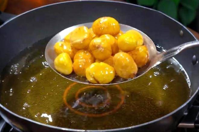 3、锅里倒上食用油,等油温到五成左右的时候,把板栗放进去炸。这时候可得注意看着点,别炸过头了。等板栗炸到表面金黄,那就可以捞出来了,这炸过的板栗,外皮变得酥脆,里面还是粉粉的,香得不得了。