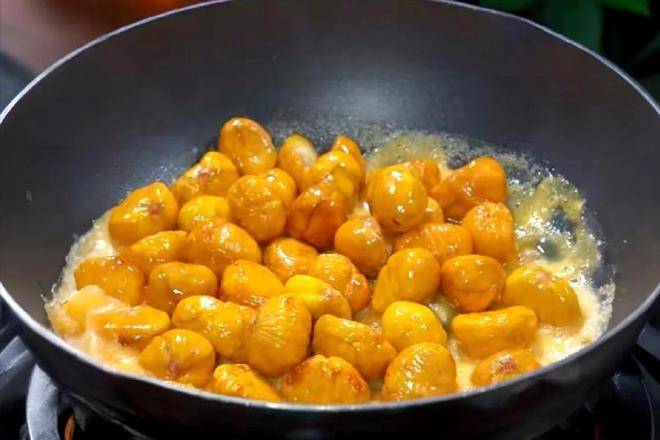 4、锅里留一点点底油,把 2 - 3 勺咸蛋黄酱放进去。开中小火慢慢炒,这咸蛋黄酱在锅里越炒越香,不一会儿就开始起泡了,把炸好的板栗倒进锅里,和炒好的咸蛋黄酱一起翻拌均匀。