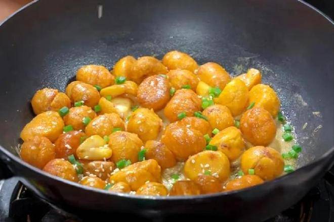 让每一颗板栗都裹上那金黄的咸蛋黄酱,翻拌好了之后,撒上葱花和芝;