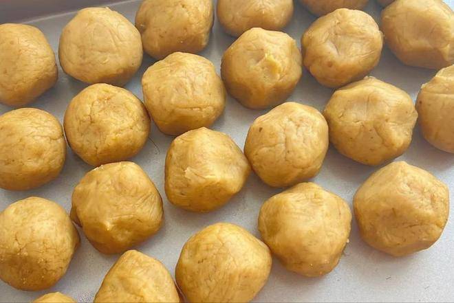 揉好之后,让面团松弛 15 分钟,等面团休息好了,把它分成 25 克一个的小面团,板栗馅分成 30 克一个的小球,然后分别搓圆。