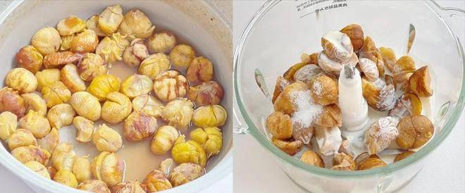 板栗馅材料:去皮板栗 250 克、150 克水、淡奶油 40 克、砂糖 35 克、黄油 20 克