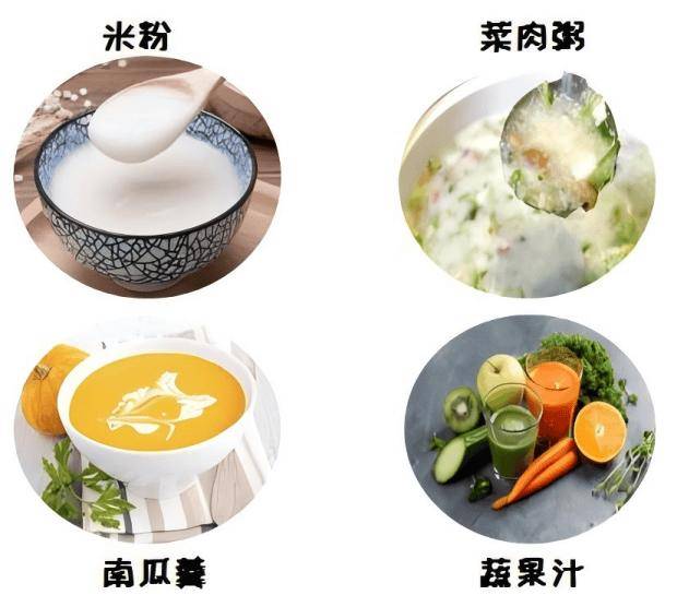 流质:米汤、藕粉、蔬菜汁、果汁(稀释)、清鸡汤、鱼汤(去油)。