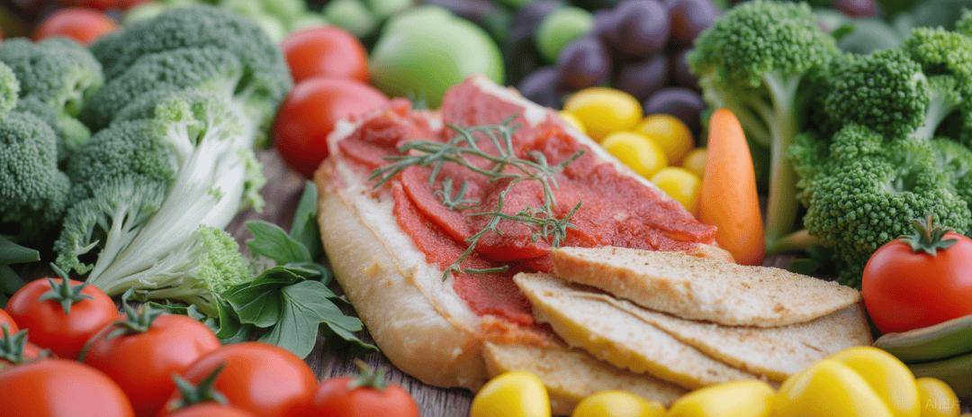 果蔬: 多种颜色的新鲜蔬菜和水果,确保维生素和纤维摄入。