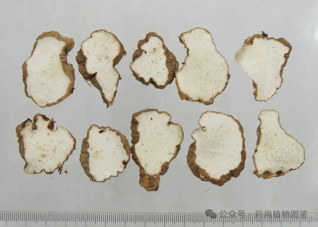 呈竹节状,类圆柱形,有分枝。表面黄白色或棕黄色,有不规则的纵沟、纵皱纹及须根痕,常残留有茎基。质硬,断面黄白色或淡灰棕色,平坦,细腻,有粉性。质地松脆、易折断,断面角质样且具粉性——这也是“粉萆薢”名称中“粉”字的由来,粉性越强,药效越佳。