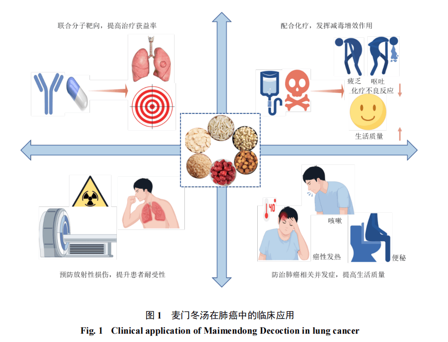 放疗主要包括根治性、辅助性、姑息性三种方式,是肺癌综合治疗中不可缺少的关键手段,但也会引起严重的放疗并发症,降低患者生活质量,干扰治疗进程,影响整体预后。中医药联合可有效预防不良反应发生,保证放疗期间患者生活质量,提高治疗依从性,延长生存期[27]。刘珺等[28]开展的临床研究以麦门冬汤联合根治性放疗为治疗组,对照组为单纯根治性放疗,治疗包括肺癌在内的30例患者,结果表明治疗组放射性肺损伤发生率仅为16.67%,远低于对照组(40%),且治疗组血浆转化生长因子-β1(transforming growth factor-β1,TGF-β1)水平显著下降,证实麦门冬汤对放射性肺损伤的预防作用,也为后续筛选有效方药提供了新的血清标志物。此外,研究发现,麦门冬汤不仅可以预防放射性肺损伤的发生,也可以治疗放射性肺损伤。吕新华[29]应用麦门冬汤合升降散治疗老年肺癌姑息放疗后放射性肺炎患者,1月后患者咳嗽胸闷好转,痰中带血消失,纳谷如常,二便调,生活质量显著提高。杨舒瑾[30]以麦门冬汤治疗乳腺癌术后放射性肺炎患者,4剂后热退,剧咳、气短、胸闷等症明显减轻,食欲渐有好转;继服6剂,咳嗽、气短、胸闷诸症消失;治疗2周后,X线胸片复查示肺部放射性炎症已基本吸收。