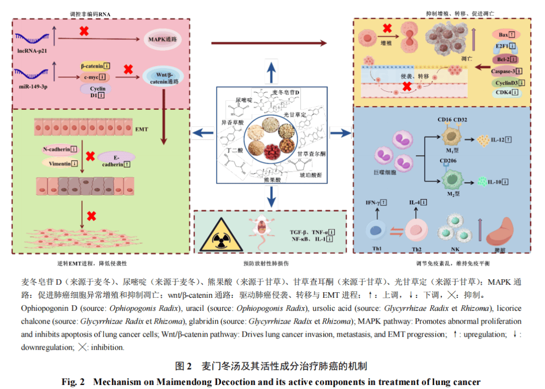 综上,体内外研究均证实麦门冬汤可抑制肺癌细胞增殖、促进肺癌细胞凋亡、自噬,并逆转肺癌细胞EMT进程,降低肺癌细胞侵袭性;还可以调控ncRNA,调节Th1/Th2平衡与巨噬细胞极化,纠正免疫紊乱;并预防肺癌放射性肺损伤,对放疗、化疗均具有协同增效作用,机制明确,见图2。且机制研究与临床研究互为支撑,再次印证麦门冬汤的抗肺癌作用,疗效确切,可在临床推广应用。