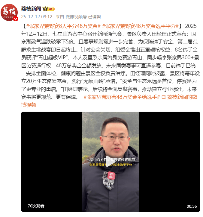 2025年12月12日,七星山游客中心召开新闻通气会,景区负责人田经理正式宣布:因寒潮致气温跌破零下5度,且赛事规则需进一步完善,为保障选手安全,第二届荒野求生挑战赛即日起终止。针对公众关切,组委会推出五重硬核权益:8名选手全员获评“青山超级VIP”,本人及直系亲属终身免费游青山,同步畅享张家界300+景区免费通行权;48万总奖金全额发放,未来同类赛事可直通参赛;目前选手已统一安排全面体检,健康问题由景区全权负责治疗。