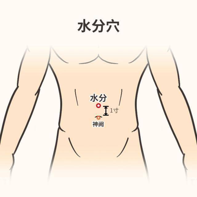 平躺或站立,找到肚脐(神阙穴),从肚脐往上量“1横指”(自己的食指宽度),刚好在前正中线上,按压时有轻微酸胀感,就是水分穴,整个腹部只有1个。