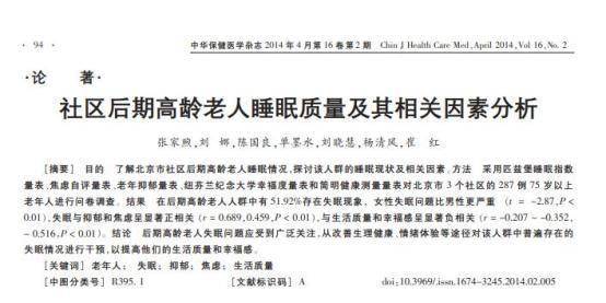 [1]张家煦.社区后期高龄老人睡眠质量及其相关因素分析, 中华保健医学杂志, 2014-04-30