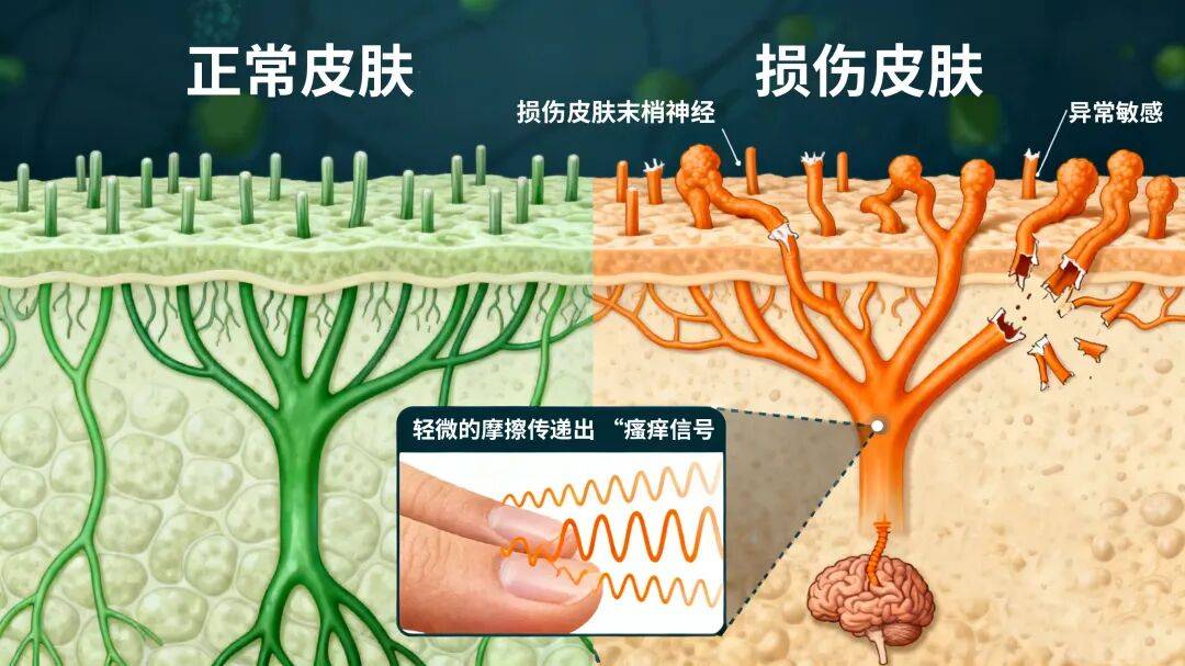 高血糖损伤皮肤末梢神经:末梢神经变得异常敏感,即使是轻微摩擦,也会传递强烈的瘙痒信号,相当于皮肤的感知系统功能异常;