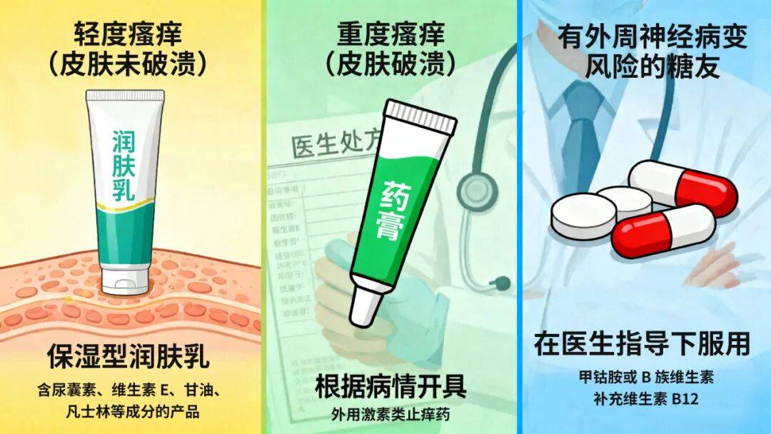 有外周神经病变风险的糖友:可在医生指导下服用甲钴胺或 B 族维生素,补充维生素 B12 以营养神经,从源头减少瘙痒诱因。