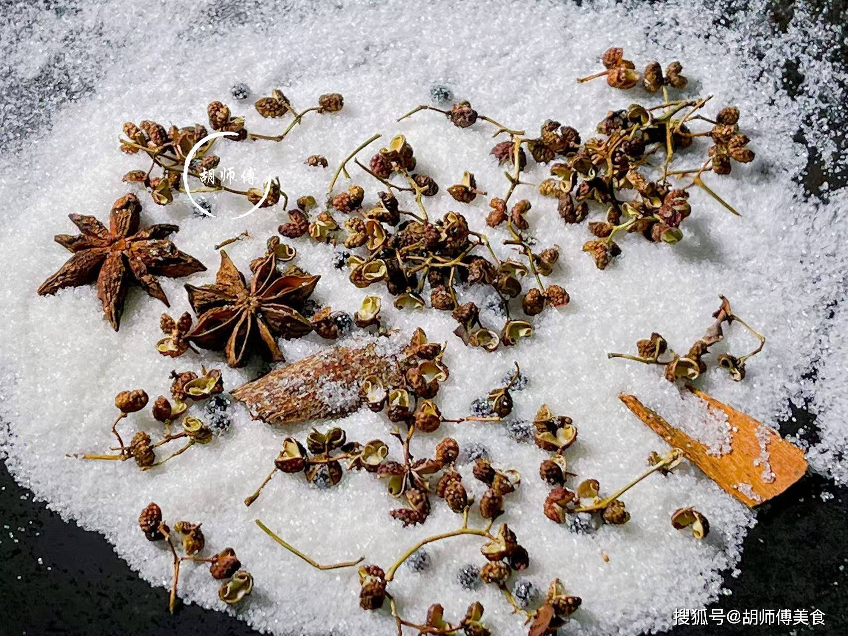 第一步:将海盐、八角、茴香、桂皮、花椒全部都放入锅中,然后开中火,将盐炒热后,闻到很浓烈的香味就可以改小火了。