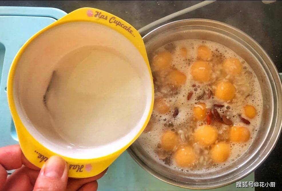 4、等圆子煮得差不多了,就把那一碗酒酿倒进去。这酒酿一倒进去,锅里立马就飘出一股甜甜的酒香,闻着就让人直流口水。