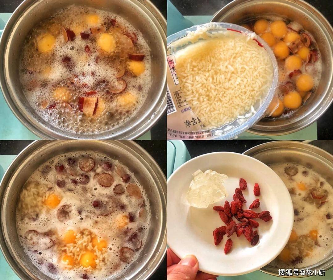 5、然后就该放冰糖和枸杞啦。最后把准备好的水淀粉拿出来,慢慢淋到锅里。一边淋一边用勺子搅拌,这时候你就会看到汤变得浓稠起来,就像给汤穿上了一件厚厚的外衣。