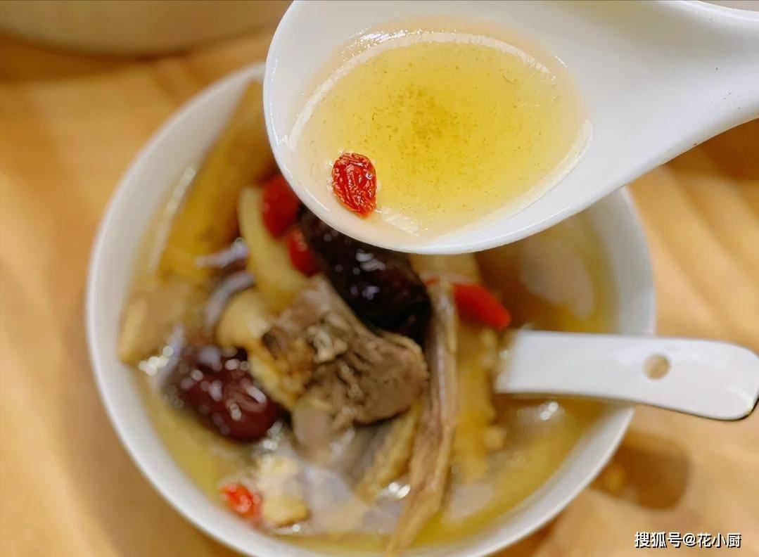 3、一个半小时很快就过去了,咱们打开炖盅,哇塞,一股浓郁的香味扑鼻而来。这时候,咱再把准备好的枸杞放进去,再加点盐调调味。