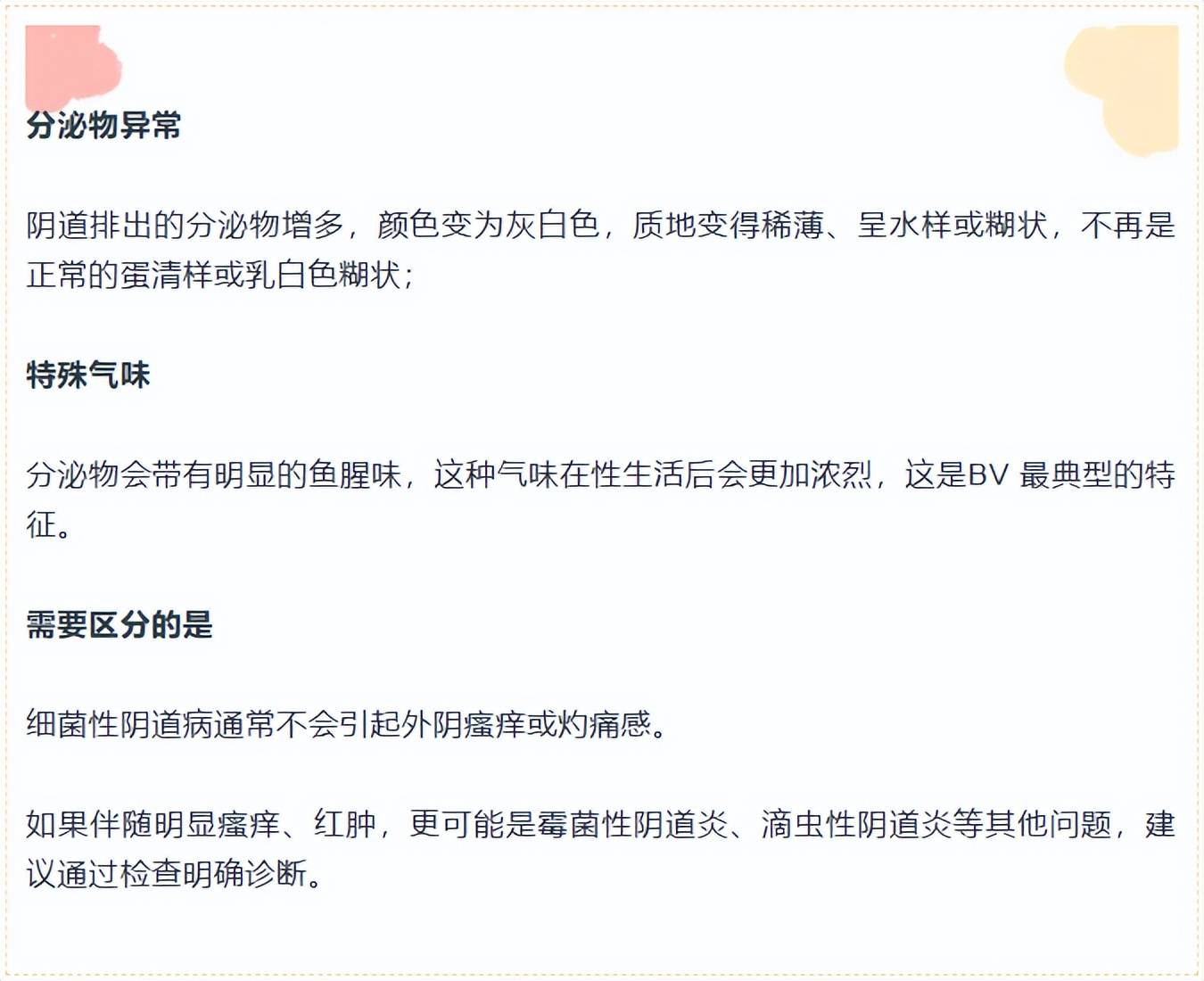重要提醒:BV不属于性传播疾病,但性生活(尤其是更换伴侣)可能诱发菌群失衡,同性伴侣间也可能通过性行为传播;此外,没有性生活的女性也可能患病,无需过度焦虑或误解。